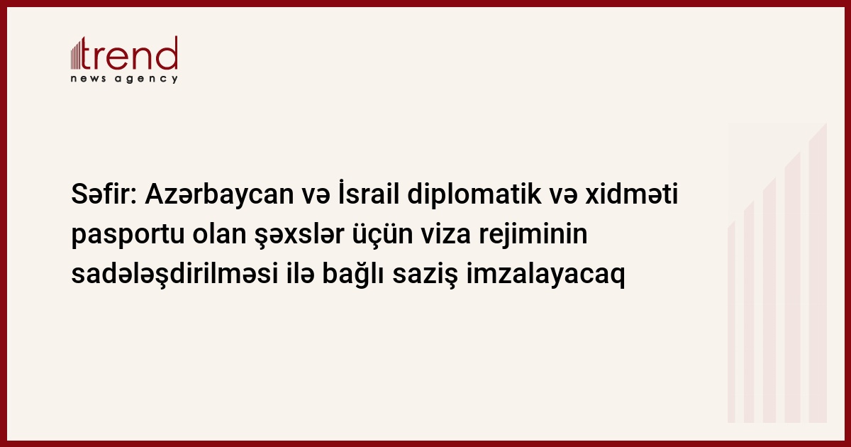 Azərbaycan və İsrail arasında diplomatik və xidməti pasporta malik şəxslər üçün viza rejiminin sadələşdirilməsi ilə bağlı saziş imzalanacaq. Trend-in məlumatına görə, bu barədə çərşənbə axşamı İsrailin Azərbaycandakı səfiri Rafael Harpaz bildirib.