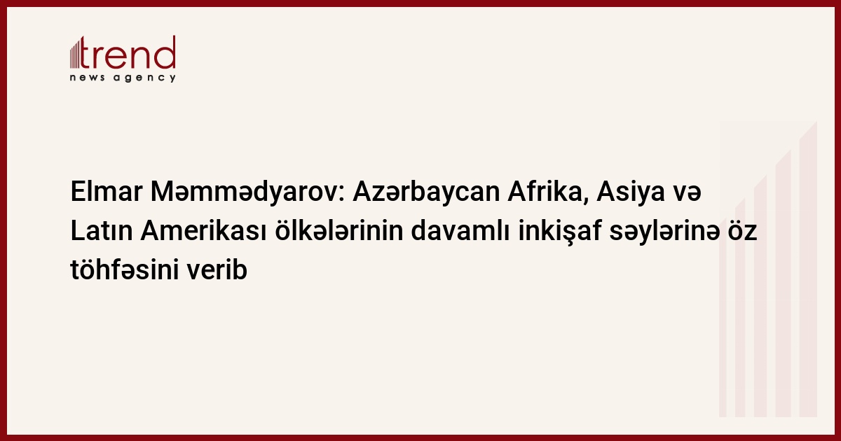 Azərbaycan artıq donor ölkəyə çevrilmiş və Afrika, Asiya və Latın Amerikası ölkələrinin davamlı inkişaf səylərinə öz töhfəsini verib. Trend-in məlumatına görə, bunu Azərbaycanın xarici işlər naziri Elmar Məmmədyarov BMT Baş Assambleyasının 68-ci sessiyasında çıxışı zamanı deyib.