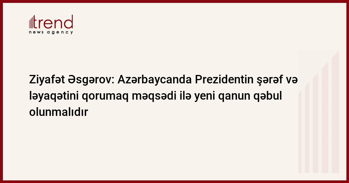 Azərbaycanda Prezidentin şərəf və ləyaqətini qorumaq məqsədilə yeni qanun qəbul olunmalıdır. Trend-in məlumatına görə, Milli Məclisin birinci vitse-spikeri Ziyafət Əsgərov parlamentin payız sessiyasının ilk iclasında bildirib.