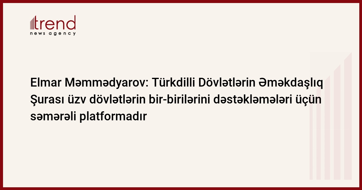 Türkdilli Dövlətlərin Əməkdaşlıq Şurası üzv dövlətlər arasında beynəlxalq arenada bir-birilərini dəstəkləmək üçün səmərəli platforma rolunu oynayır. Trend-in Azərbaycan Xarici İşlər Nazirliyinin mətbuat xidmətinə istinadən verdiyi məlumata görə, bunu Azərbaycanın xarici işlər naziri Elmar Məmmədyarov BMT Baş Assambleyasının 68-ci sessiyasında iştirak etmək üçün Nyu-Yorka səfəri çərçivəsində Türkdilli Dövlətlərin Əməkdaşlıq Şurasının xarici işlər nazirlərinin görüşündə bildirib.
