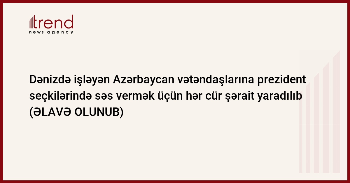 V.Sadıqovun sözlərinə görə, prezident seçkiləri günü dənizdə olacaq bütün gəmilərdə seçki prosesinin təmin olunması məqsədilə seçki məntəqələri yaradılıb: "Bu gəmilərin heyət üzvlərinin siyahısı təsdiqlənib və müvafiq olaraq onlar bu məntəqələrdə səs verəcəklər".