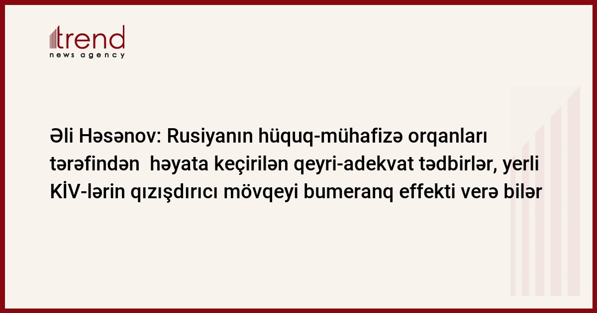 Rusiyanın hüquq-mühafizə orqanları tərəfindən həyata keçirilən qeyri-adekvat tədbirlər, yerli KİV-lərin qızışdırıcı mövqeyi bumeranq effekti verə bilər. Trend-in məlumatına görə, bunu jurnalistlərə açıqlamasında Azərbaycan Respublikası Prezidenti Administrasiyası İctimai-siyasi məsələlər şöbəsinin müdiri Əli Həsənov Moskvada Orxan Zeynalovun törətdiyi hadisəyə və bir neçə gündür bunun ətrafında cərəyan edən məsələlərə münasibətini bildirərəkən deyib.
