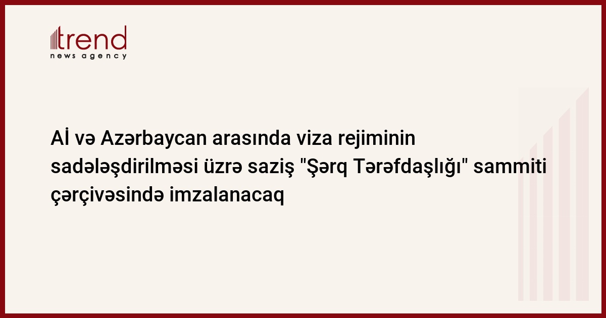 Avropa İttifaqı (Aİ) və Azərbaycan arasında viza rejiminin sadələşdirilməsi haqqında saziş çox güman ki, Vilnüsdə keçiriləcək "Şərq Tərəfdaşlığı" sammiti çərçivəsində imzalanacaq. Trend-in məlumatına görə, bunu Aİ-nin Azərbaycandakı nümayəndəliyinin müvəqqəti işlər vəkili Toralf Pilts jurnalistlərin suallarını cavablandırarkən deyib.