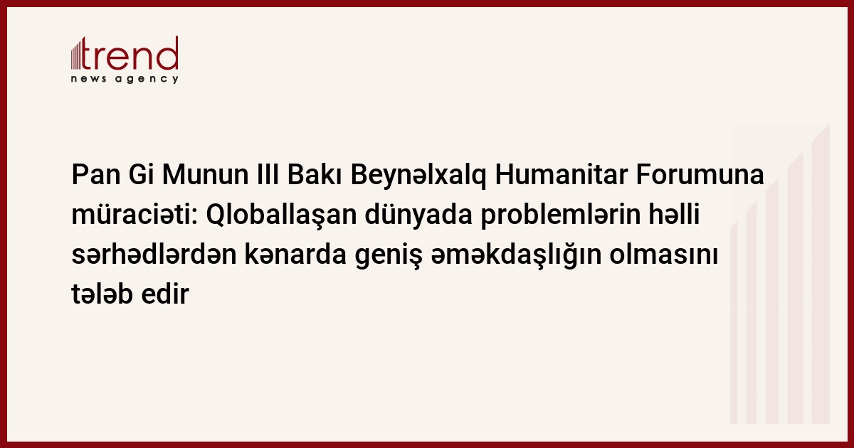 BMT-nin Baş katibi Pan Gi Mun III Bakı Beynəlxalq Humanitar Forumunun iştirakçılarına müraicət ünvanlayıb.