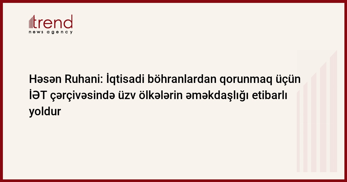 "Dünyada son illərdə yaranmış və gələcəkdə ehtimal olunan iqtisadi böhranlardan qorunmaq üçün İqtisadi Əməkdaşlıq Təşkilatı (İƏT) çərçivəsində üzv ölkələrin əməkdaşlıqları və yaxınlaşması etibarlı yoldur". Bunu İran Prezidenti Həsən Ruhani bu gün Tehranda İƏT Xarici İşlər Nazirləri Şurasının XXI iclasının açılış mərasimində çıxışı zamanı deyib. Trend-in məlumatına görə, bu barədə İRİNN xəbər agentliyi məlumat verir.