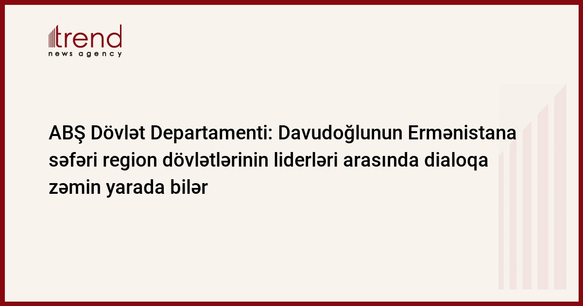 Türkiyənin xarici işlər naziri Əhməd Davudoğlunun Yerevanda keçiriləcək Qara Dəniz İqtisadi Əməkdaşlıq Şurasının toplantısında iştirakı region dövlətlərinin liderləri arasında dialoq üçün zəmin yarada bilər. Trend-in "Anadolu" agentliyinə istinadən verdiyi məlumata əsasən, ABŞ Dövlət Departamentinin verdiyi açıqlamada belə deyilir.