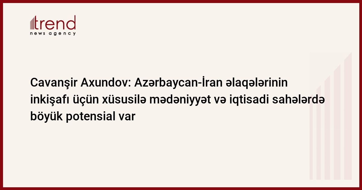 İran və Azərbaycan arasında əlaqələrin inkişaf etdirilməsi üçün xüsusilə mədəniyyət və iqtisadi sahələrdə böyük potensial mövcuddur. Trend-in məlumatına görə, bunu Azərbaycanın İrandakı səfiri Cavanşir Axundov "Mehr" agentliyinə müsahibəsində deyib.