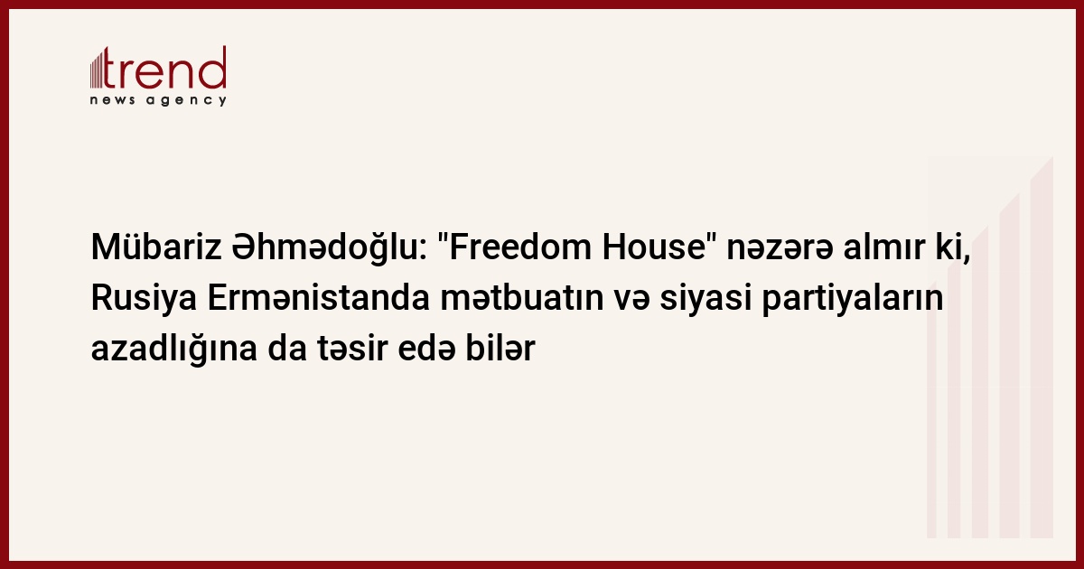 "Freedom House" Ermənistan və Dağlıq Qarabağı yenidən "qismən azad" elan etdi. Eyni zamanda Rusiyanı Ermənistanı qorxutmaqda ittiham etdi. Dövlət müstəqilliyini qoruya bilməyən Ermənistanın mətbuatın və siyasi partiyaların müstəqilliyini qoruması nonsensdir. Trend-in məlumatına görə, bu barədə Siyasi İnnovasiya və Texnologiyalar Mərkəzinin rəhbəri, politoloq Mübariz Əhmədoğlu bu gün keçirdiyi mətbuat konfransında deyib.