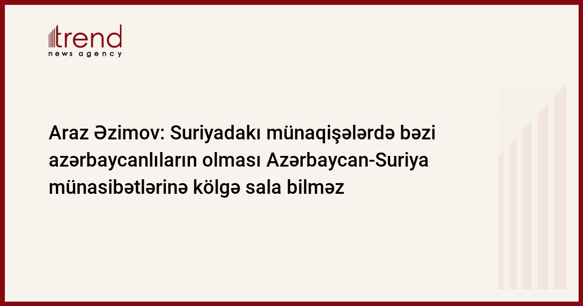 "Azərbaycan Suriyadakı vəziyyətin sülh yolu ilə həll edilməsində maraqlı olduğunu və dəstəyini bəyan edib". Trend-in məlumatına görə, bunu Azərbaycanın xarici işlər nazirinin müavini Araz Əzimov jurnalistlərə bildirib.