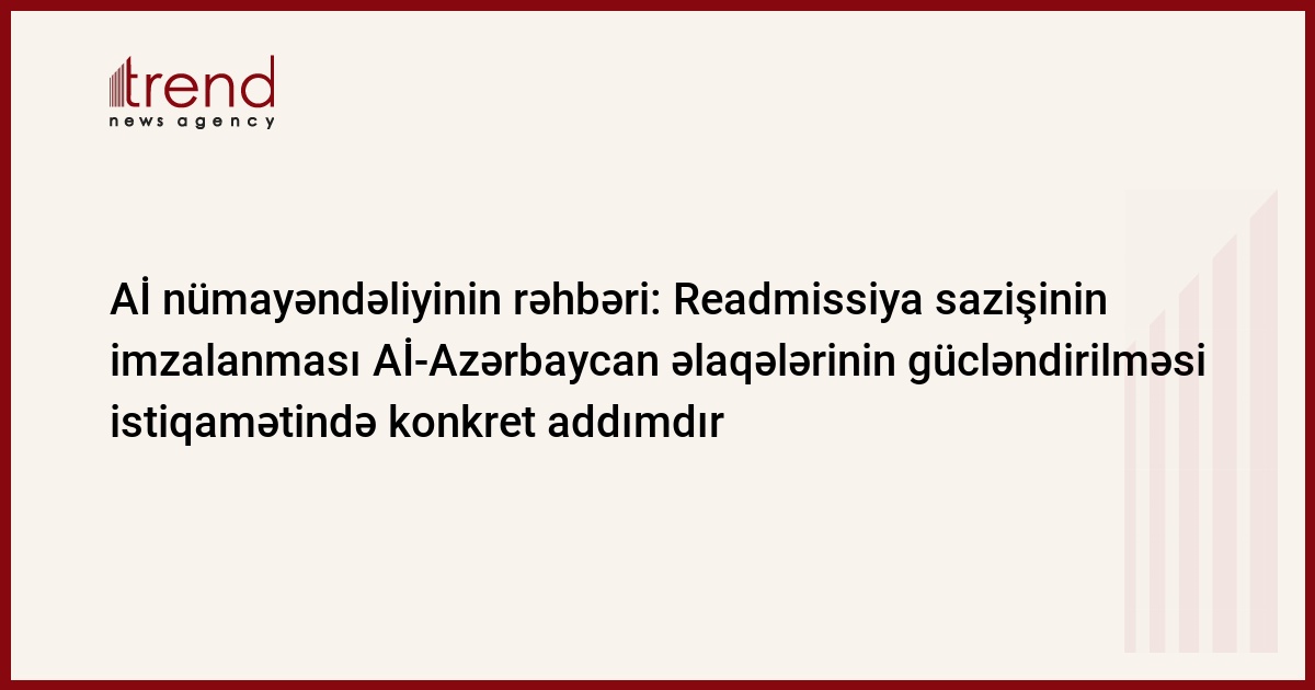 Readmissiya sazişinin imzalanması Avropa ittifaqı və Azərbaycan arasında əlaqələrinin gücləndirilməsi və dərinləşdirilməsi istiqamətində konkret addımdır. Trend-in Avropa İttifaqının Azərbaycandakı Nümayəndəliyinin saytına istinadən verdiyi məlumata görə, bunu Nümayəndəliyin rəhbəri Malena Mard deyib.