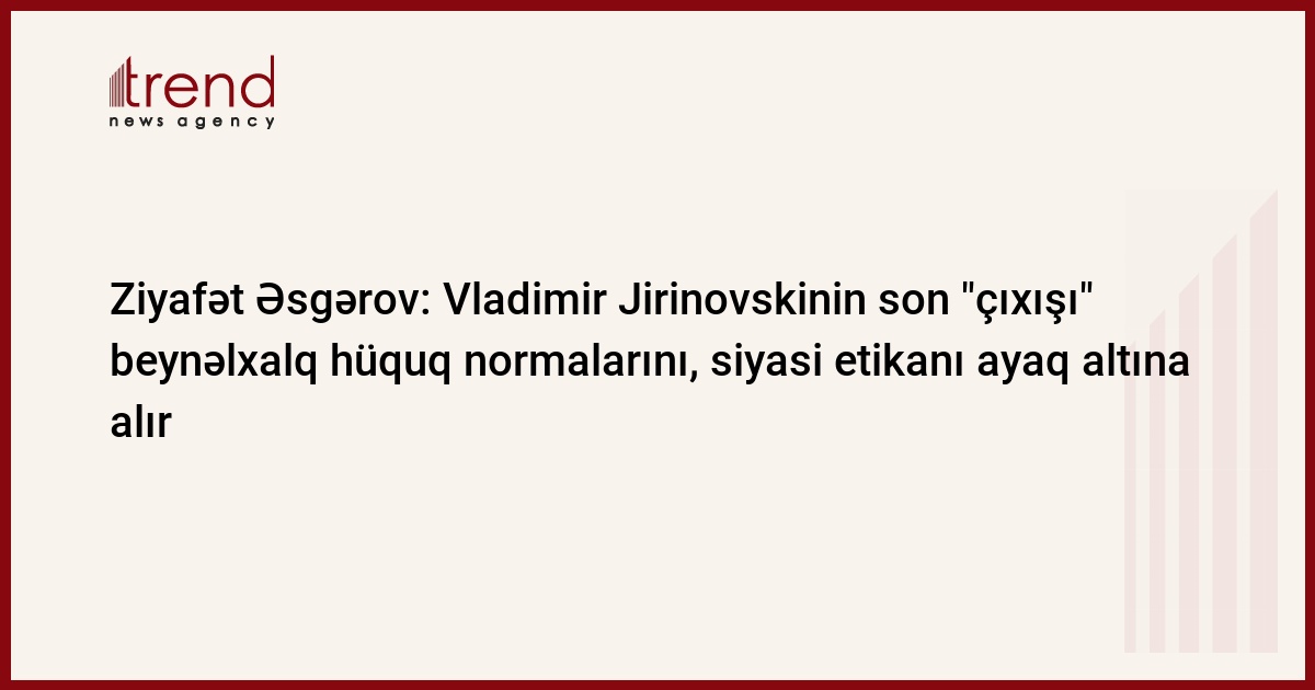 Rusiya Dövlət Dumasının vitse-spikeri Vladimir Jirinovskinin son "çıxışı" beynəlxalq hüquq normalarını, siyasi etikanı ayaq altına alır. Trend-in məlumatına görə, bunu jurnalistlərə Milli Məclisi sədrinin 1-ci müavini Ziyafət Əsgərovun V.Jirinovskinin Azərbaycan xalqının ünvanına söylədiklərinə münasibəti bildirərkən deyib.