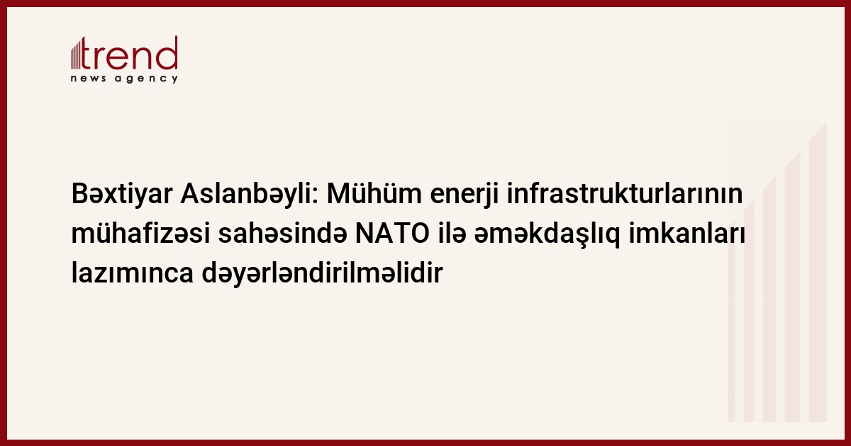Enerji infrastrukturunun təhlükəsizlik təminatı ilə bağlı sualı cavablandıran B.Aslanbəyli bildirib ki, hazırda bu sahədə durum ciddi narahatlığa səbəb olmasa da, gələcək perspektivləri, xüsusən də Xəzər hövzəsi resurslarının daha böyük həcmdə Avropaya ixracı imkanlarını və bölgədəki infrastrukturun Avropanın enerji təminatının diversifikasiyasında daha əhəmiyyətli rol oynayacağı ehtimalını nəzərə alsaq, Azərbaycan və Gürcüstandakı enerji infrastrukturlarının təhlükəsizliyinin beynəlxalq təminatı üçün müvafiq addımların atılması zəruridir. Ekspert hesab edir ki, mühüm enerji infrastrukturlarının mühafizəsi sahəsində NATO ilə əməkdaşlıq imkanları lazımınca dəyərləndirilməlidir.