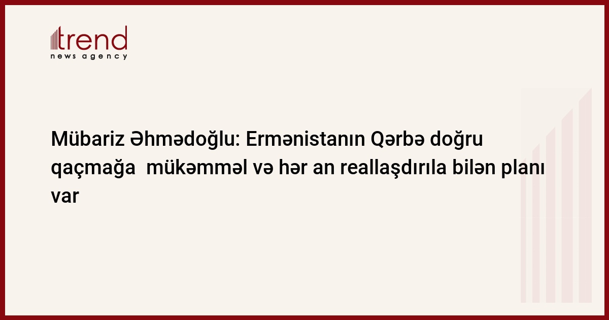 "Qərbə doğru qaçmağa Ermənistanın mükəmməl və hər an reallaşdırıla bilən planı var". Bunu Trend-ə Siyasi İnnovasiya və Texnologiyalar Mərkəzinin rəhbəri, politoloq Mübariz Əhmədoğlu deyib.