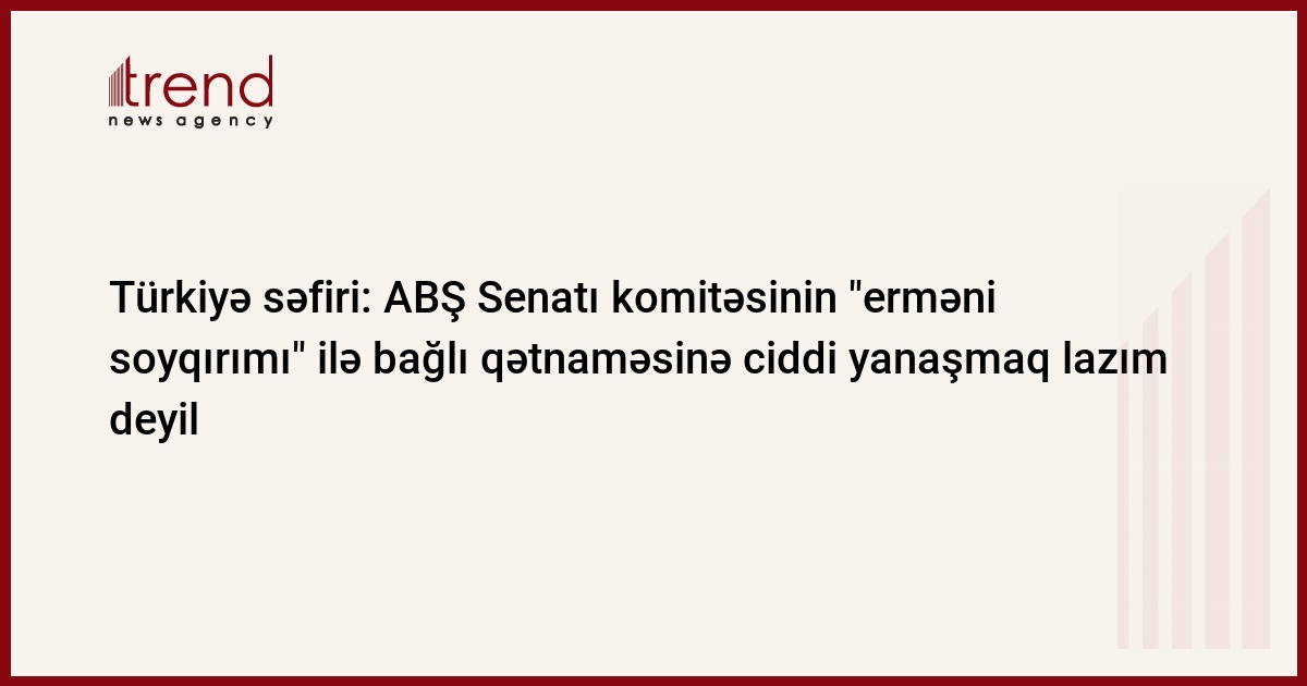"ABŞ Senatı komitəsinin qondarma "erməni soyqırımı"nın tanınması haqqında qətnamə qəbul etməsinə ciddi yanaşmaq lazım deyil, tarixi hadisələrə siyasi qiymət vermək olmaz, bu, tarixçilərin işidir". Trend-in məlumatına görə, bu barədə cümə günü jurnalistlərə Türkiyənin Azərbaycandakı səfiri İsmayıl Alper Coşqun ABŞ Senatının Xarici əlaqələr komitəsinin qondarma "erməni soyqırımı"nın tanınması haqqında qətnaməni qəbul etməsini şərh edərkən deyib.