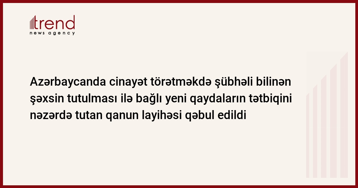 Milli Məclisin bu gün keçirilən plenar iclasında Azərbaycanda cinayət törətməkdə şübhəli bilinən şəxsin tutulması ilə bağlı yeni qaydalar tətbiq edilməsini nəzərdə tutan qanun layihəsi qəbul olunub.