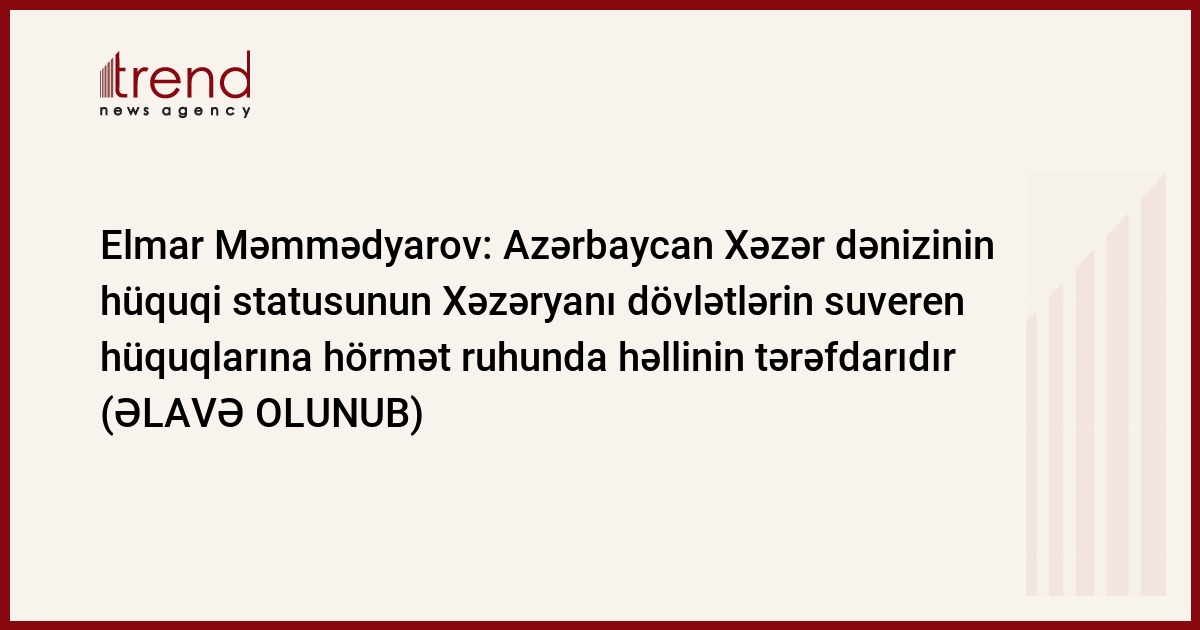 Azərbaycan əməkdaşlığın bütün sahələrinə, o cümlədən Xəzər dənizinin hüquqi statusuna dair məsələlərin Xəzəryanı dövlətlərin suveren hüquqlarına hörmət ruhunda, qarşılıqlı tərəfdaşlıq, sülh vasitələri və danışıqlar yolu ilə həllinə sadiqliyini bir daha təqsdiq edir. Trend-in XİN-in mətbuat xidmətinə istinadən verdiyi məlumata görə, Azərbaycanın bu mövqeyini XİN rəhbəri Elmar Məmmədyarov bu gün Moskvada Xəzəryanı dövlətlərin xarici işlər nazirlərinin iclasında deyib.