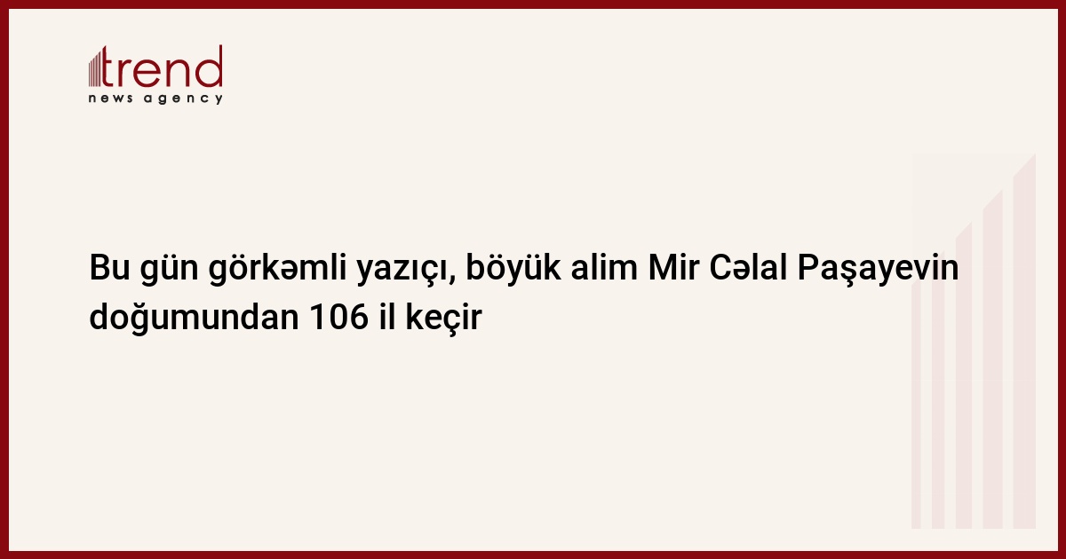 Bu gün Azərbaycan elminin, ədəbiyyatının, təhsilinin inkişafında misilsiz xidmətlər göstərmiş xeyirxah insan, görkəmli yazıçı, böyük alim Mir Cəlal Paşayevin anadan olmasından 106 il keçir.