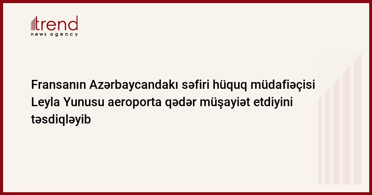 Fransanın Azərbaycandakı səfiri Paskal Mönye hüquq müdafiəçisi Leyla Yunusu aeroporta şəxsən müşayiət etməsi barədə məlumatı təsdiqləyib. Trend-in məlumatına görə, bu barədə səfir jurnalistlərə deyib.