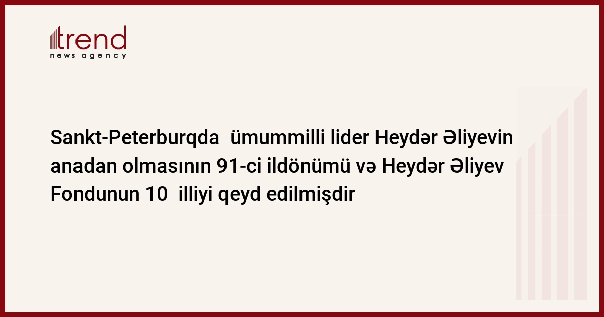 Mayın 3-də Sankt-Peterburq Filarmoniyasının Kiçik Salonunda Azərbaycan xalqının ümummilli lideri Heydər Əliyevin anadan olmasının 91-ci ildönümünə və Heydər Əliyev Fondunun 10 illiyinə həsr edilmiş təntənəli konsert olmuşdur.
