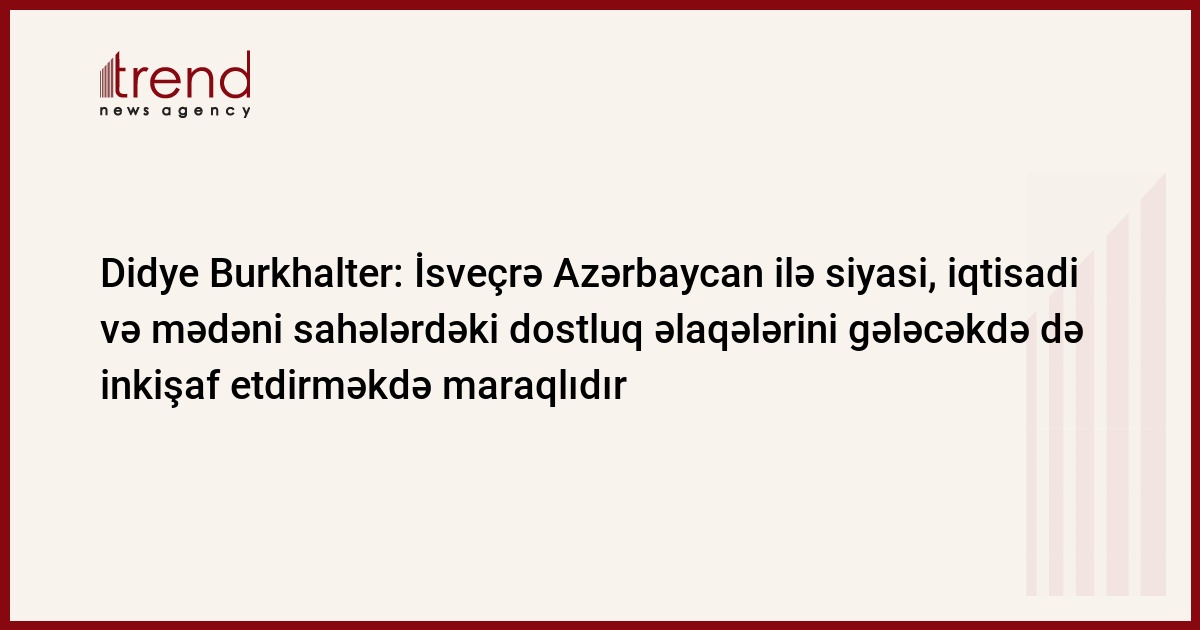 İcazə verin, İsveçrənin Azərbaycan ilə siyasi, iqtisadi və mədəni sahələrdəki dostluq əlaqələrini gələcəkdə də inkişaf etdirməkdə maraqlı olduğunu bir daha təsdiqləyim.