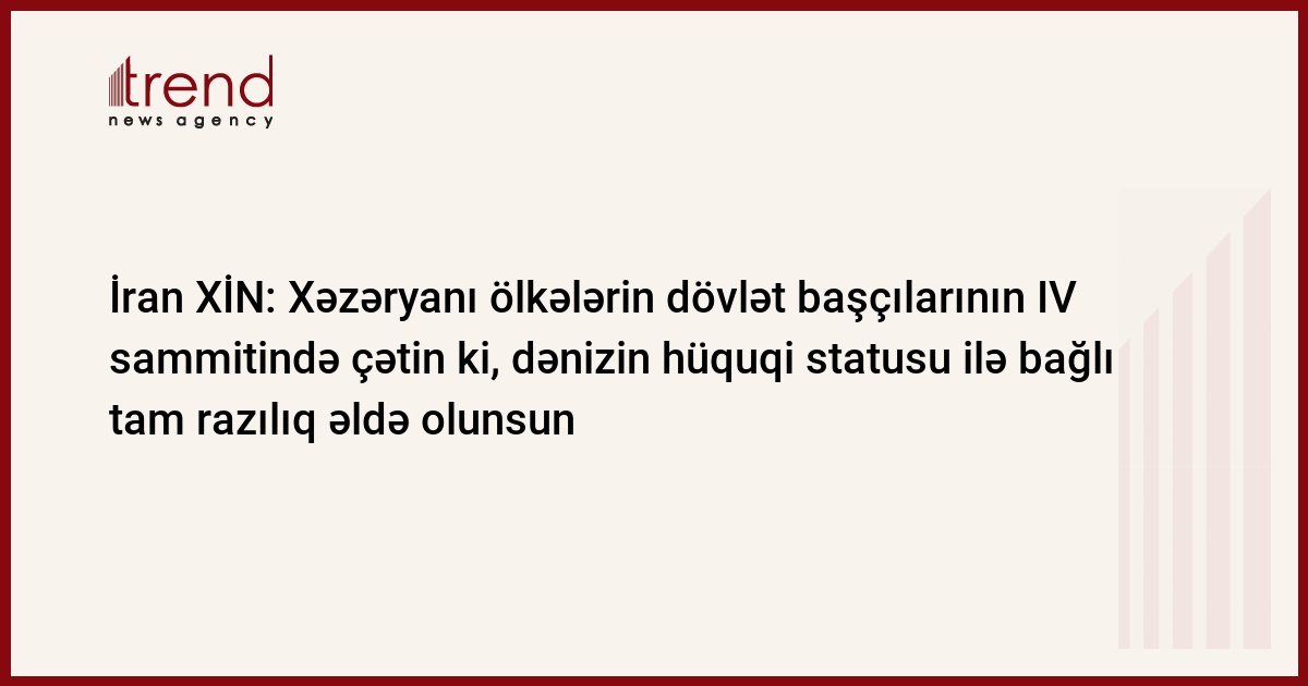 "Xəzəryanı ölkələrin dövlət başçılarının Həştərxanda keçiriləcək dördüncü sammitində çətin ki, dənizin hüquqi statusu ilə bağlı tam razılıq əldə olunsun, lakin işlərin gedişatı əlverişlidir və o qədər də ümidsiz deyilik". Trend-in "Mehr" agentliyinə istinadən verdiyi məlumata görə, bunu İran xarici işlər nazirinin Asiya və Okeaniya ölkələri üzrə müavini və bu ölkənin Xəzər məsələləri üzrə xüsusi nümayəndəsi İbrahim Rəhimpur Ramsər şəhərində jurnalistlərə deyib.