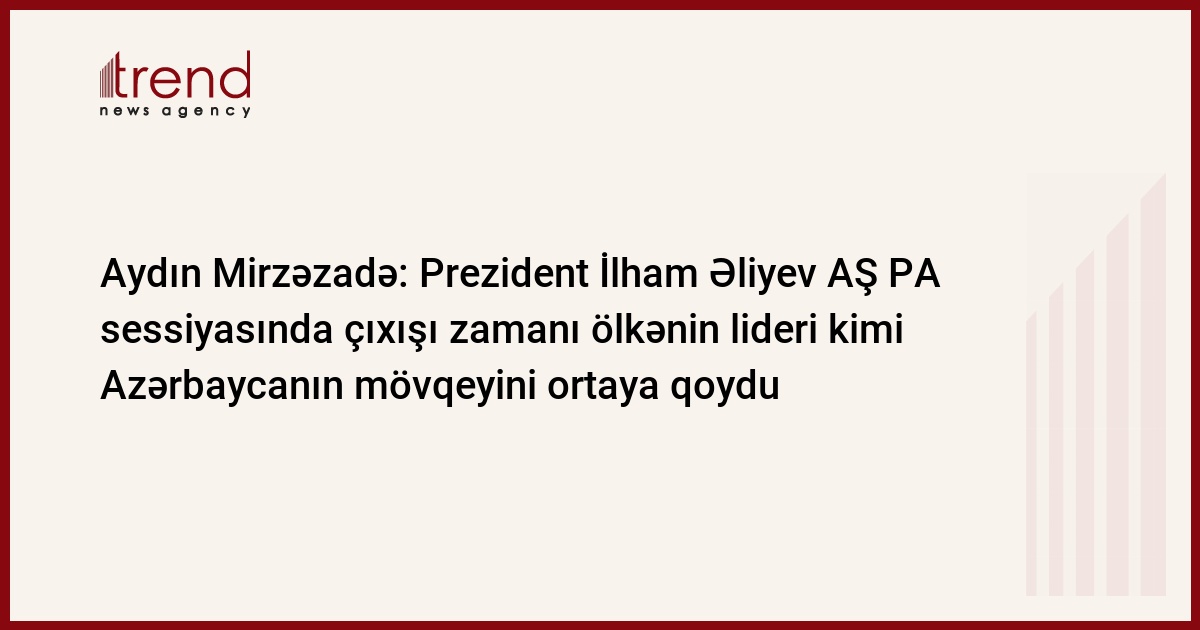 "Cənab Prezident İlham Əliyev Avropa Şurası Parlament Assambleyasının (AŞ PA) sessiyasında çıxışı zamanı güclənən, öz maraqlarını bilən və qoruyan, demokratiyaya bağlı olan bir ölkənin lideri kimi Azərbaycanın bir sıra məsələlərə dair mövqeyini ortaya qoydu. Eyni zamanda, AŞ PA Nazirlər Şurasına yarım il rəhbərlik edəcək bir ölkə kimi Azərbaycanda demokratik cəmiyyət quruculuğundakı uğurlarımızdan danışdı". Bunu Trend-ə millət vəkili Aydın Mirzəzadə deyib.