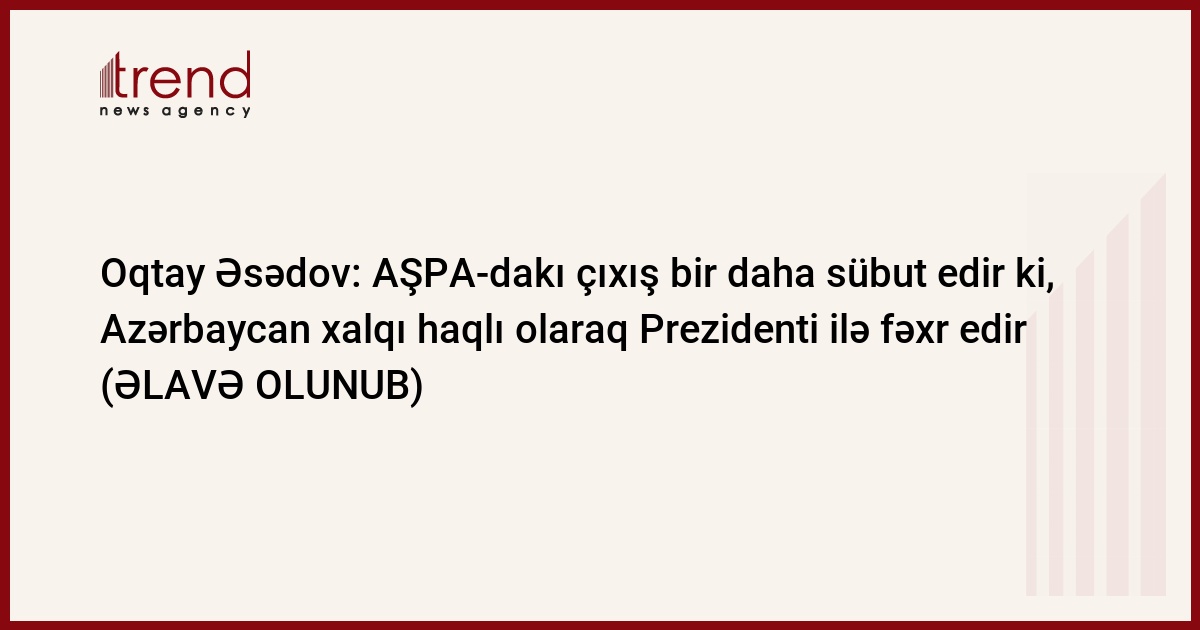 "Azərbaycan Prezidenti İlham Əliyev AŞPA-da dərin məzmunlu çıxşı ilə qarşıda dayanan məsələlər, o cümlədən Dağlıq Qarabağ məsələsi ilə bağlı dəyərli fikirlər söylədi". Trend-in məlumatına görə, bunu Milli Məclisin bu gün keçirilən plenar iclasında spiker Oqtay Əsədov deyib.