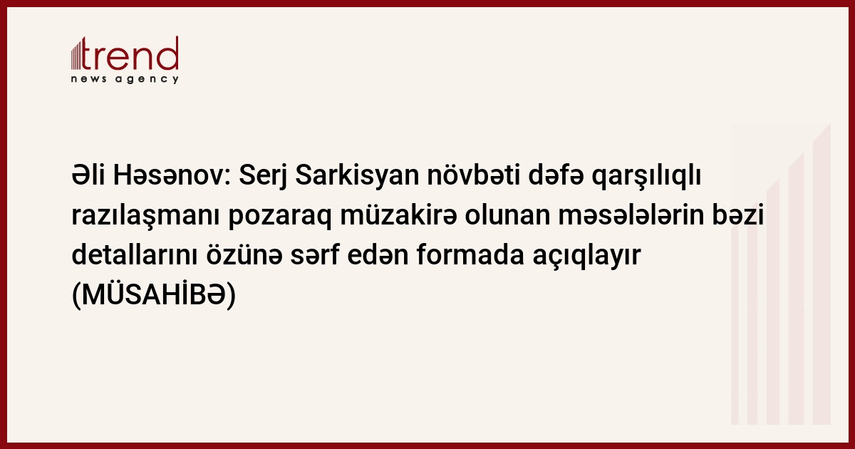 Trend Azərbaycan Respublikası Prezidenti Administrasiyası ictimai-siyasi məsələlər şöbəsinin müdiri Əli Həsənovun AzərTAc-a müsahibəsini təqdim edir