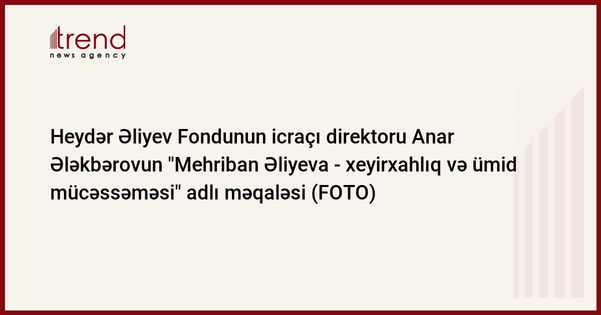 "İnterfaks" informasiya agentliyi Heydər Əliyev Fondunun icraçı direktoru Anar Ələkbərovun "Mehriban Əliyeva - xeyirxahlıq və ümid mücəssəməsi" adlı məqaləsini dərc edib. Trend həmin məqaləni oxucuların diqqətinə təqdim edir.