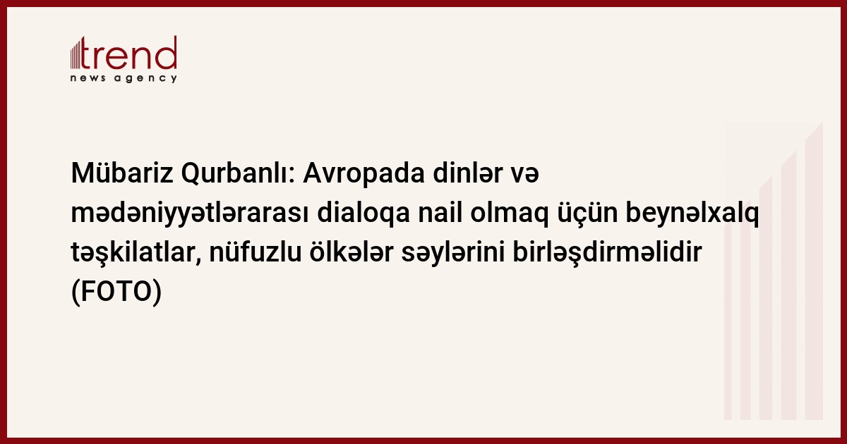 "Mədəniyyətlərin nüvəsini təşkil edən dinlər universal dəyərlər sisteminin başlanğıc nöqtəsi və ilkin formasıdır. Bu baxımdan dinlər arasındakı dialoqu mədəniyyətlərarası dialoqun ilkin mərhələsi və ya onu şərtləndirən əsas amil və ölçü kimi qəbul etmək olar". Trend xəbər verir ki, bunu Dini Qurumlarla İş üzrə Dövlət Komitəsinin sədri Mübariz Qurbanlı Bakıda "Mədəniyyətlərarası dialoq: mədəniyyət və din arasında qarşılıqlı əlaqə" mövzusunda keçirilən 2014-cü il mədəniyyətlərarası dialoqun dini ölçüsü üzrə Avropa Şurasının mübadilə görüşünün açılış mərasimində bildirib.