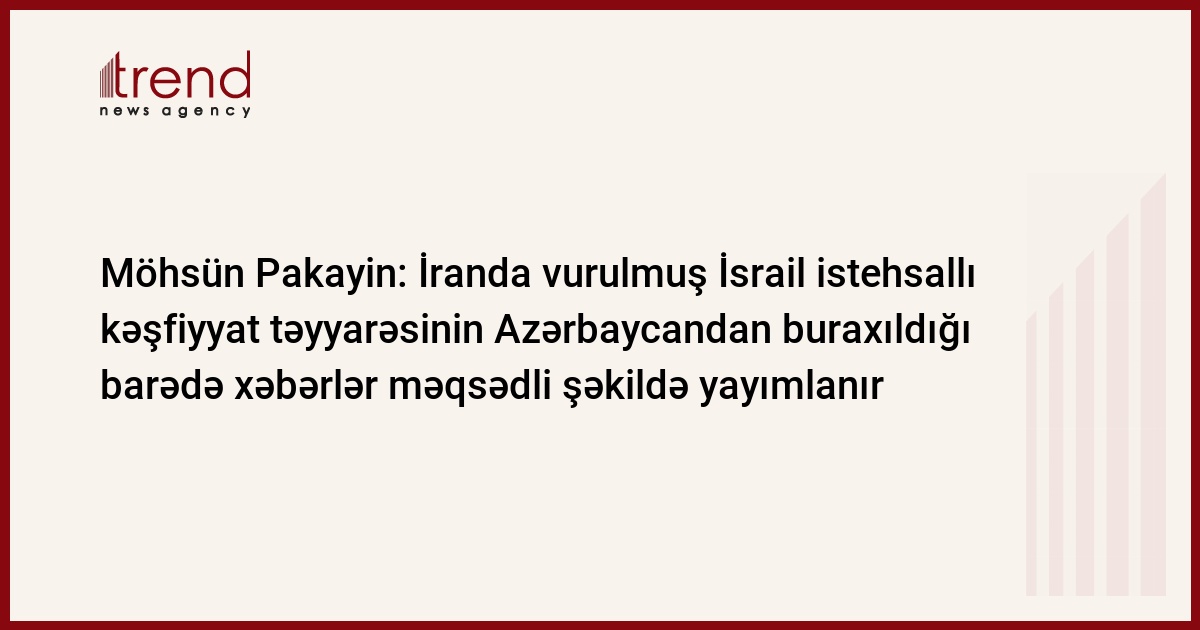 İranın Azərbaycandakı səfiri Möhsün Pakayin İranda vurulmuş İsrail istehsalı olan kəşfiyyat təyyarəsinin Azərbaycan ərazisindən buraxıldığı barədə yayılan məlumatları təkzib edib.