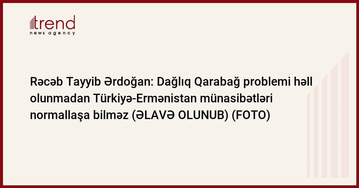Dağlıq Qarabağ problemi həll olunmadan Türkiyə-Ermənistan münasibətləri normallaşa bilməz. Trend-in xüsusi müxbirinin verdiyi məlumata görə, bunu Türkiyə Prezidenti Rəcəb Tayyib Ərdoğan Bakıda Azərbaycan Prezidenti İlham Əliyevin iştirakı ilə Azərbaycan və Türkiyə nümayəndə heyətlərinin geniş tərkibli görüşündə bildirib.