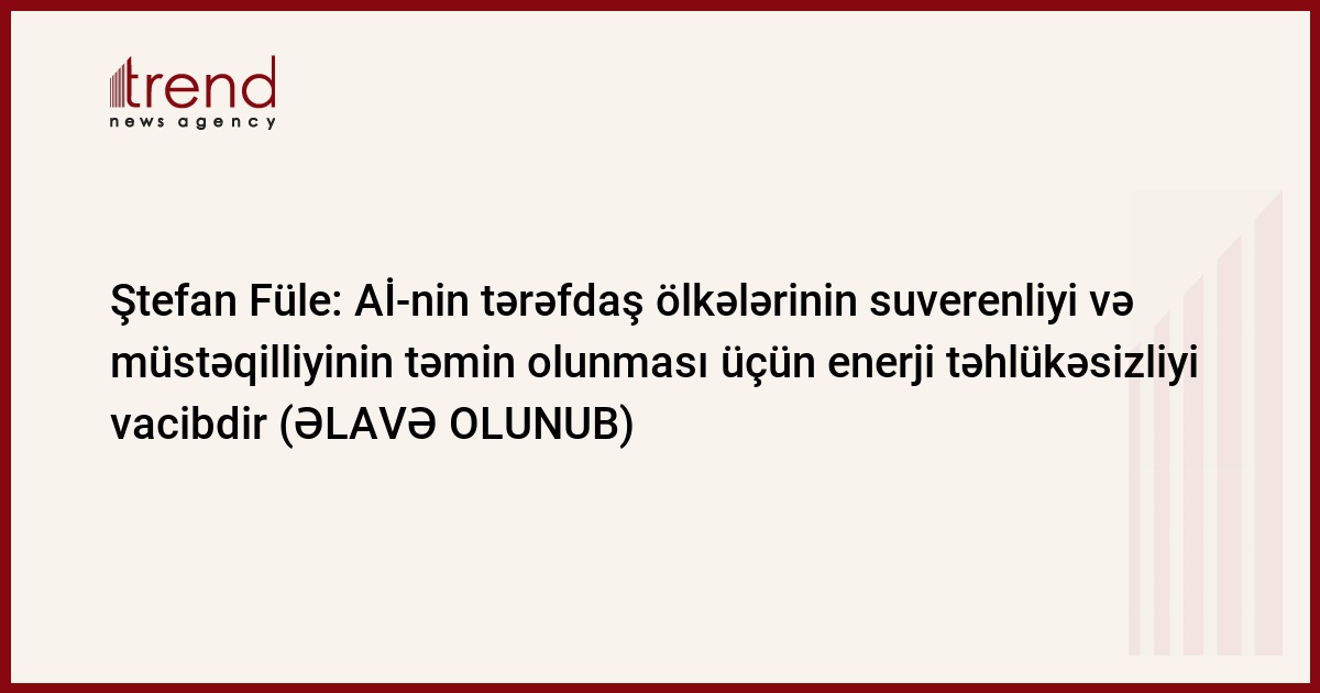 Aİ-nin tərəfdaş ölkələrinin suverenliyi və müstəqilliyinin təmin olunması üçün enerji təhlükəsizliyi vacibdir. Trend xəbər verir ki, bunu Aİ-nin Genişlənmə və Avropa Qonşuluq Siyasəti üzrə komissarı Ştefan Füle Bakıda Aİ-nin "Şərq tərəfdaşlığı" proqramının iştirakçısı olan ölkələrin XİN rəhbərlərinin dördüncü qeyri-formal görüşünün açılışında deyib.