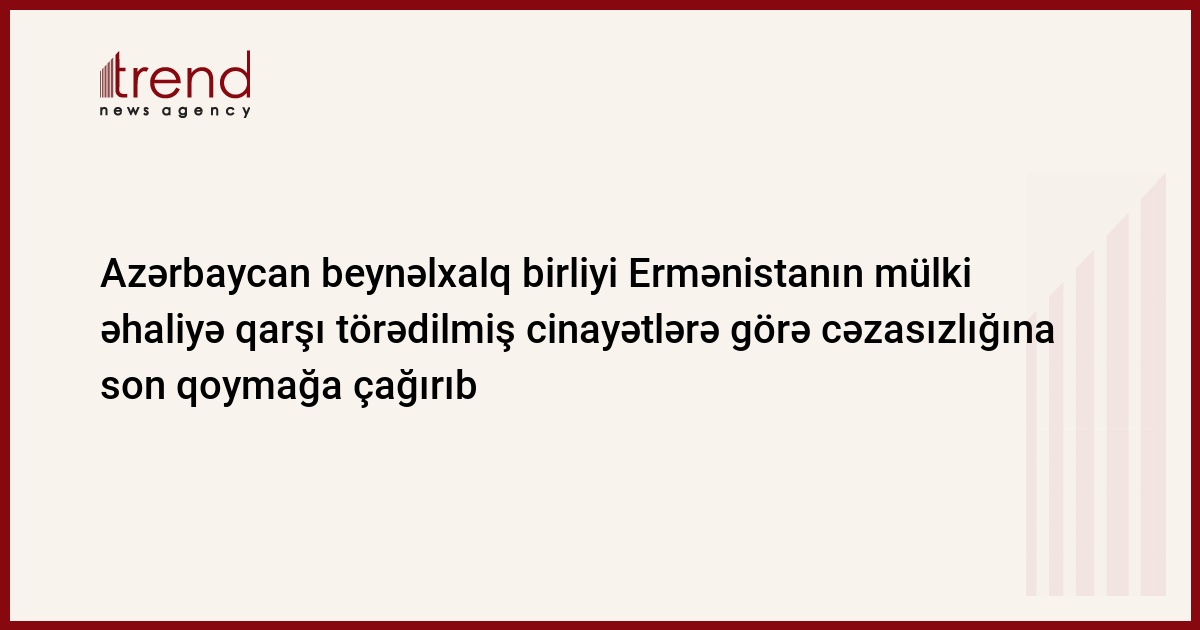 Azərbaycan beynəlxalq birliyi Ermənistanın mülki əhaliyə qarşı törədilmiş cinayətlərə görə cəzasızlığına son qoymağa çağırıb. Trend-in məlumatına görə, bunu Azərbaycanın xarici işlər naziri Elmar Məmmədyarov şənbə günü BMT-nin Baş Assambleyasının 69-cu Sessiyasının ümumi müzakirələrində çıxışı zamanı bildirib.