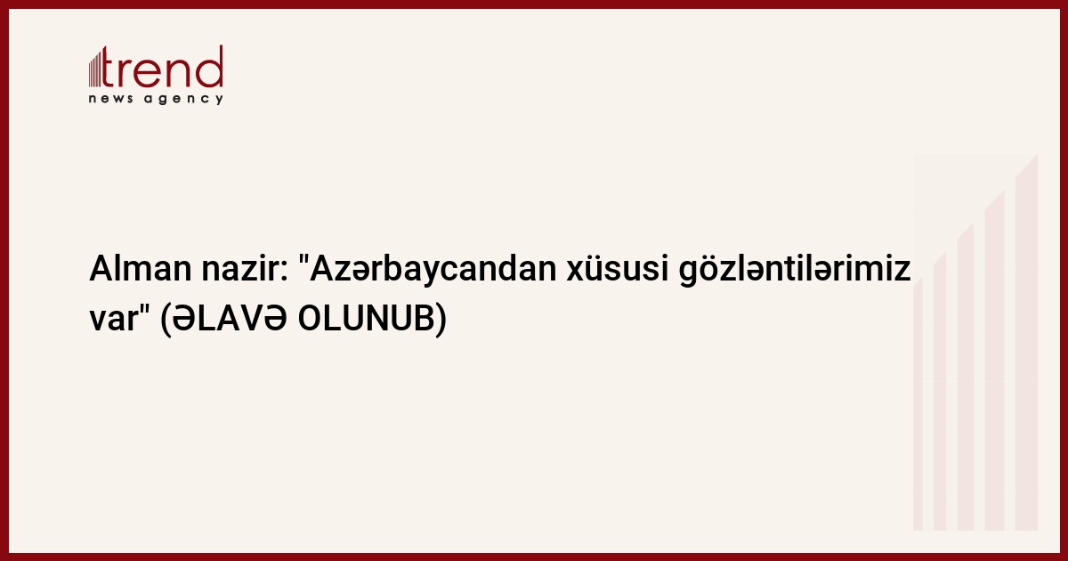 Onun sözlərinə görə, bu gün iki ölkə arasında ticarət əlaqələri yüksək səviyyədədir. Ötən il Azərbaycanla Almaniya arasında əmtəə dövriyyəsinin həcmi 3 milyard dollara yaxın olub: "Biz bu gün Avropa Şurası Nazirlər Komitəsinə sədrlik edən Azərbaycanın yerinə yetirdiyi missiyanı alqışlayırıq. Bizim bu missiya çərçivəsində Azərbaycandan xüsusi gözləntilərimiz var".