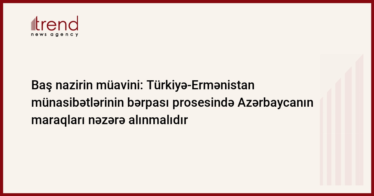 Türkiyə-Ermənistan münasibətlərinin bərpası prosesində Azərbaycanın maraqları nəzərə alınmalıdır. Trend-in məlumatına görə, bunu Türkiyə Baş nazirinin müavini Yalçın Ağdoğan KİV işçilərinin beynəlxalq konfransı çərçivəsində keçirilən mətbuat konfransında deyib.