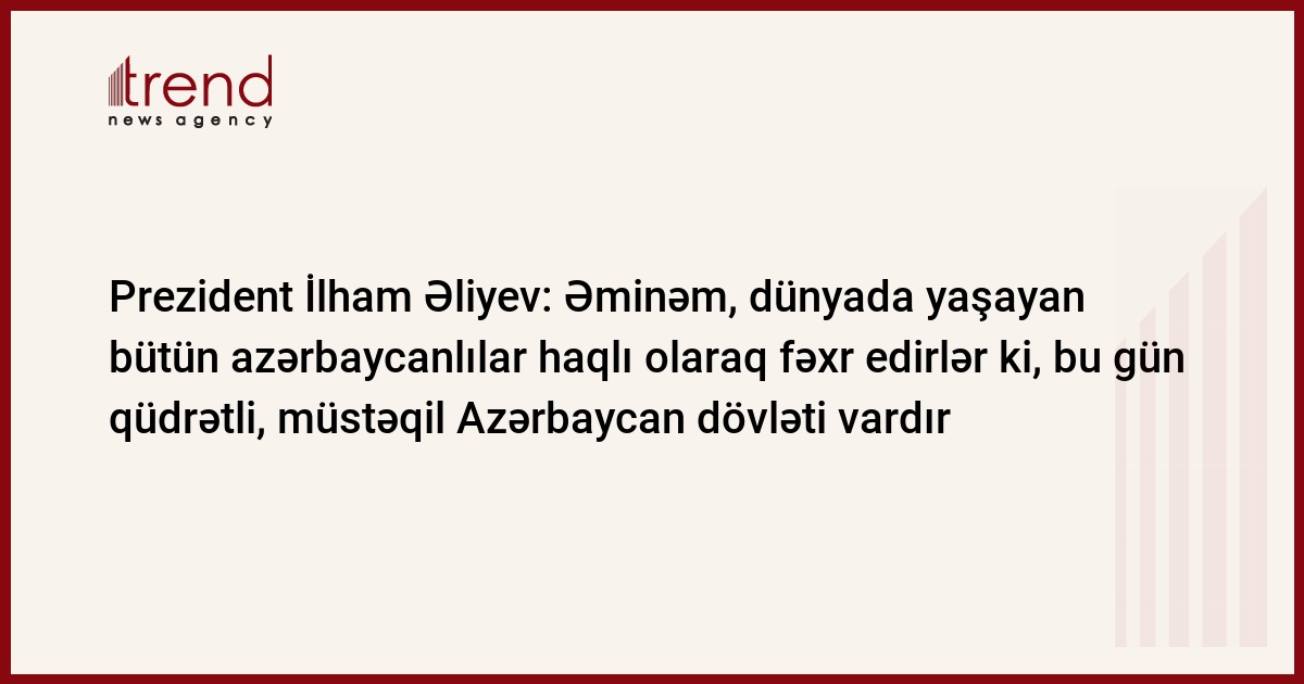 Əziz dostlar, bu gün Dünya Azərbaycanlılarının Həmrəyliyi Günüdür. Əminəm, dünyada yaşayan bütün azərbaycanlılar haqlı olaraq fəxr edirlər ki, bu gün qüdrətli, müstəqil Azərbaycan dövləti vardır. Müstəqillik bizim üçün ən böyük xoşbəxtlikdir, ən böyük sərvətdir. Biz 23 ildir ki, müstəqilik və müstəqil siyasət aparırıq. Milli maraqlar, milli dəyərlər üzərində qurulmuş bu müstəqil siyasət bugünkü Azərbaycan reallıqlarını təmin edir. Bu gün Azərbaycan dinamik, sürətlə inkişaf edən ölkədir. Azərbaycan demokratiya, azadlıq, müstəqillik, tərəqqi, inkişaf yolu ilə uğurla gedən ölkədir. Əminəm, dünyada yaşayan bütün azərbaycanlılar fəxr edirlər ki, bu gün dünya xəritəsində Azərbaycan kimi dövlət var, öz sözünü deyir, deyəcək və bizim uğurlu inkişafımız bundan sonra da təmin ediləcəkdir.