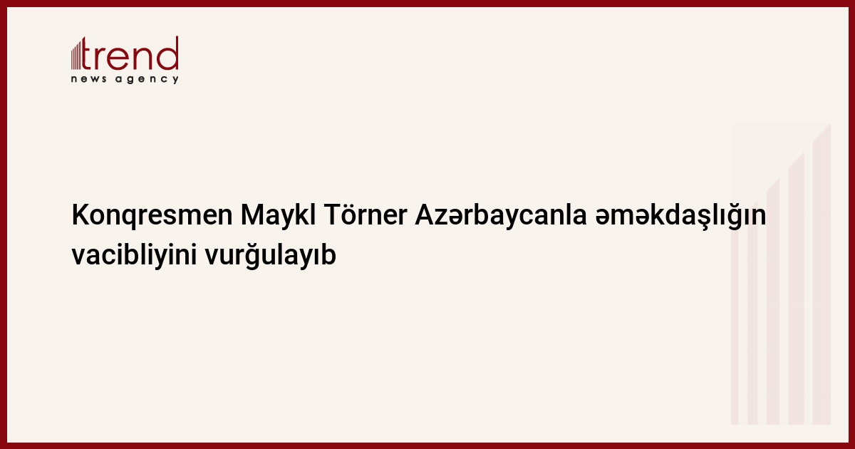Trend-in məlumatına görə, bəyanatda konqresmen Maykl Törner xüsusilə Azərbaycanın Avropanın enerji təhlükəsizliyinə töhfəsini vurğulayaraq, Bakı-Tbilisi-Ceyhan boru kəməri və Cənub qaz dəhlizinin əhəmiyyətindən bəhs edib.
