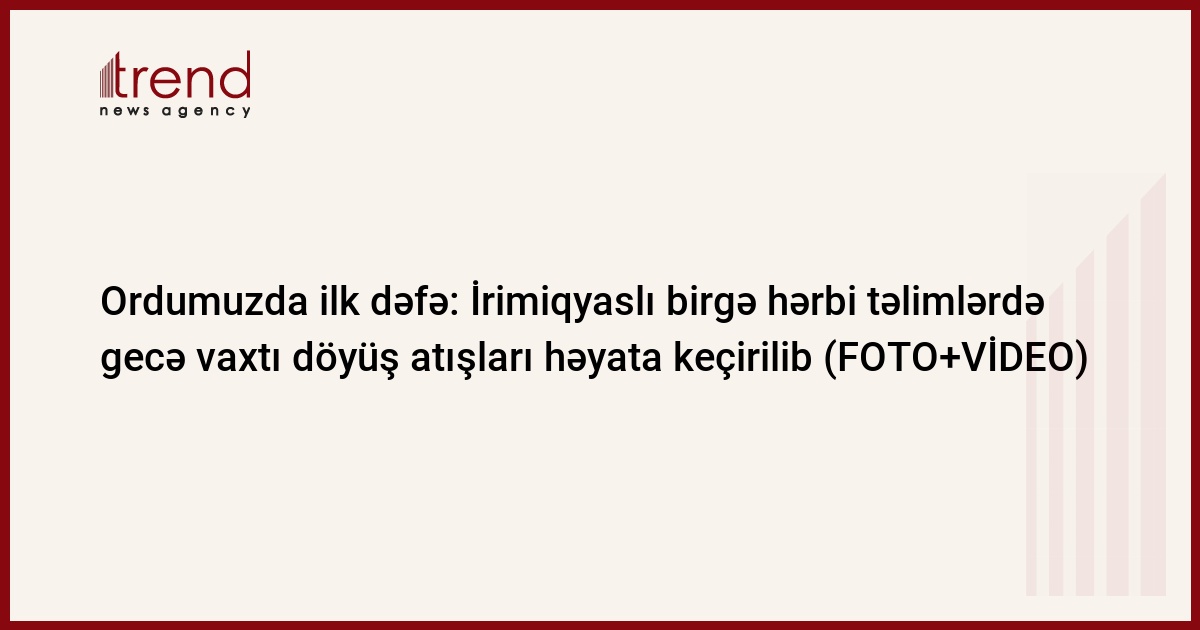 Müdafiə Nazirliyinin mətbuat xidmətindən Trend-ə bildiriblər ki, Azərbaycan Respublikasının Prezidenti, Silahlı Qüvvələrin Ali Baş Komandanı cənab İlham Əliyevin tapşırığına əsasən Silahlı Qüvvələrin bütün qoşun növlərinin cəlb olunması ilə aprelin 5-dən başlanan irimiqyaslı birgə təlimlərin gecə vaxtı döyüş atışı mərhələsi keçirilib.