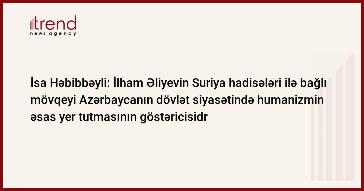 Azərbaycan Prezidenti İlham Əliyevin dünyada baş verən proseslər, konkret olaraq, Suriya hadisələri ilə bağlı ölkəmizin humanitar siyasətini ifadə etməsi Azərbaycanda indiyə qədər aparılan dövlət siyasətinin tam məntiqi davamıdır.