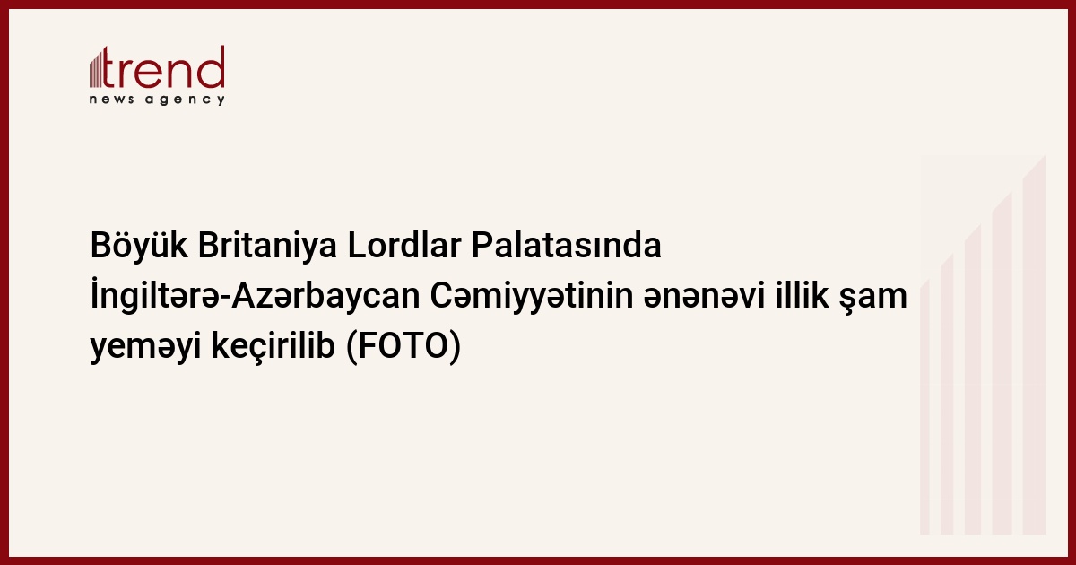 Dekabrın 2-də Böyük Britaniya Lordlar Palatasının məşhur “The Peers” zalında İngiltərə-Azərbaycan Cəmiyyətinin ənənəvi illik şam yeməyi keçirilib.