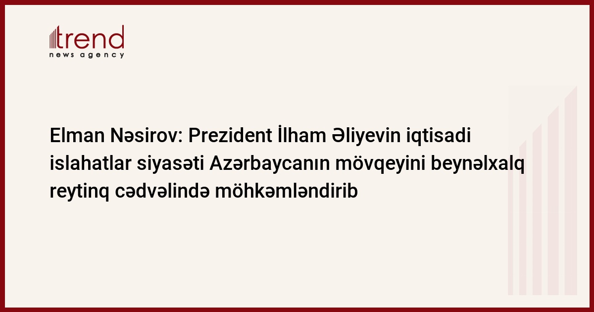 "İki il əvvəl həmin hesabatda Azərbaycan 40-cı yerdə idi, ötən il bu rəqəm 37 oldu, bu il isə artıq 35-ci yerdəyik. Bu onu göstərir ki, Azərbaycan iqtisadi inkişafda sürətlə irəliləyir. Prezidentin məqsədi ondan ibarətdir ki, Azərbaycan inkişaf etmiş dövlətlər sırasında olsun".