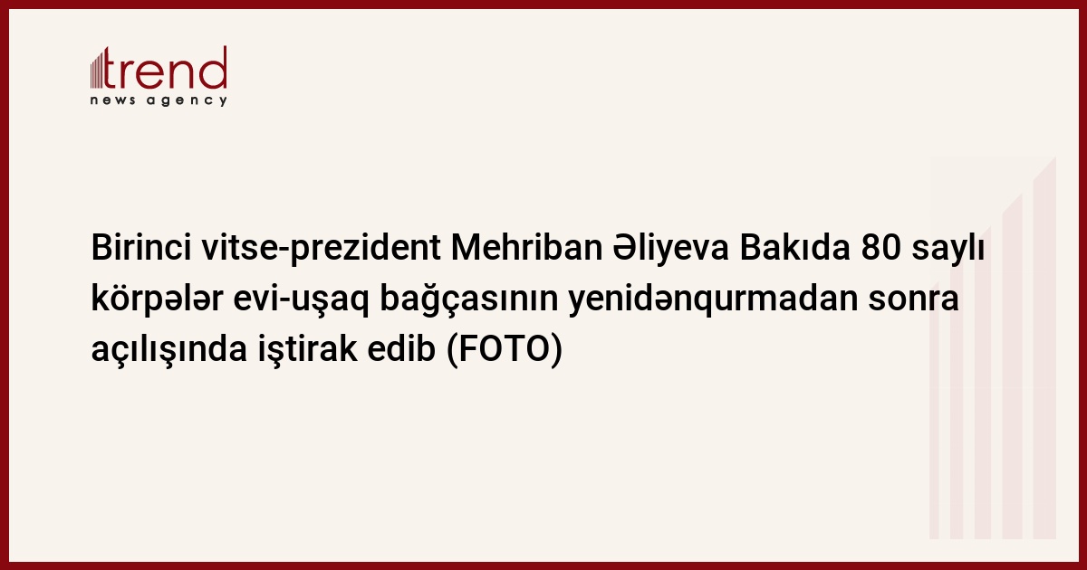 Bakının Nərimanov rayonunda Heydər Əliyev Fondunun təşəbbüsü ilə əsaslı yenidən qurulan 80 saylı körpələr evi-uşaq bağçasının martın 6-da açılışı olub.