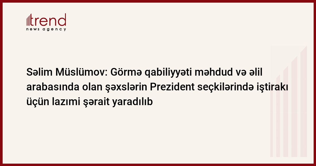 S.Müslümov ümumilikdə bu məsələlərlə bağlı daimi olaraq Mərkəzi Seçki Komissiyası ilə əlaqəli fəaliyyətin həyata keçirildiyini qeyd edib: "Əlil arabasında olan seçicilərin olduğu seçki məntəqələri müəyyən edilib və həmin seçki məntəqələrində panduslar quraşdırılıb. Yəni, ümumilikdə 1500-dək seçki məntəqəsində, yəni əlil arabasında olan seçicilərin yaşadığı bütün məntəqələrdə onlar üçün pandusların quraşdırılması, digər imkanların yaradılması təmin edilib. Hazırda elə bir seçki məntəqəsi yoxdur ki, orada əlil arabasından istifadə edən seçici olsa da həmin məntəqədə onun səsverməsi üçün şərait olmasın”.