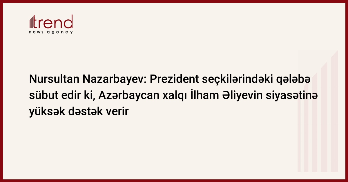 Təbrikdə deyilir: "Hörmətli İlham Heydər oğlu. Azərbaycan Respublikasının Prezidenti seçkilərində inamlı qələbəniz münasibətilə Sizi Qazaxıstan xalqı adından və şəxsən öz adımdan təbrik edirəm.