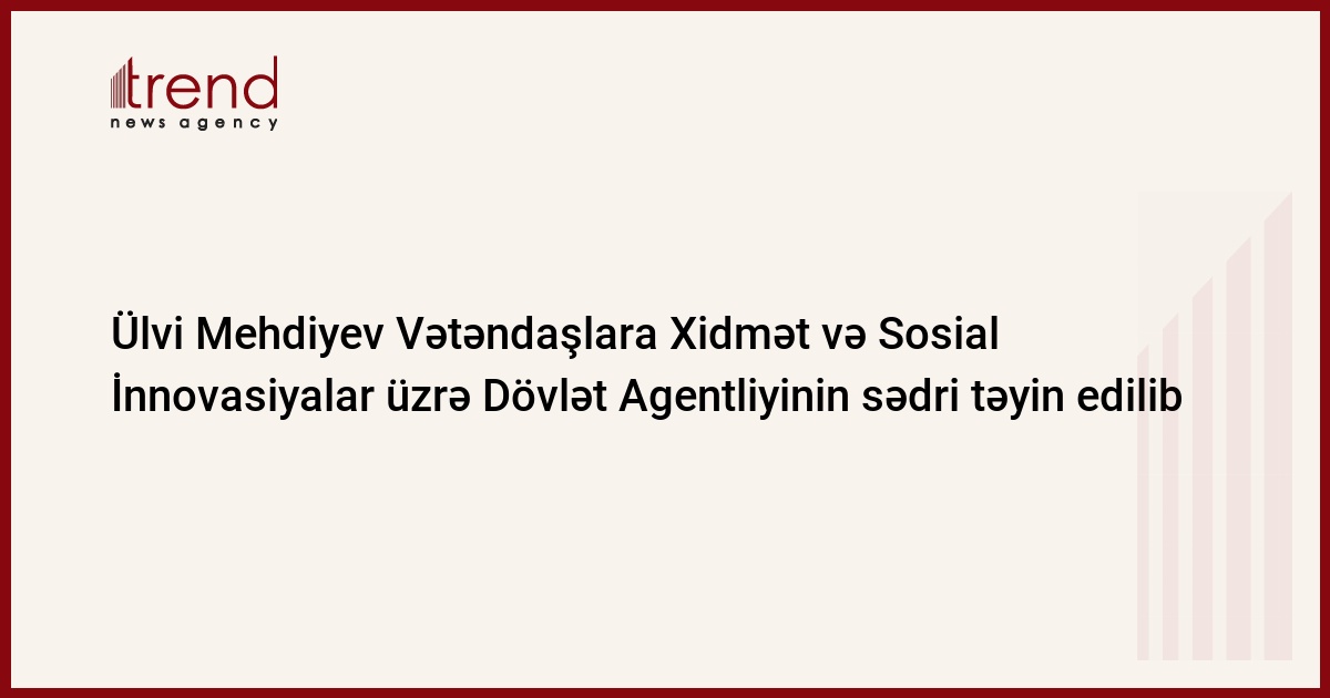 Prezident İlham Əliyev Ülvi Mehdiyevin Azərbaycan Respublikasının Prezidenti yanında Vətəndaşlara Xidmət və Sosial İnnovasiyalar üzrə Dövlət Agentliyinin sədri təyin edilməsi haqqında sərəncam imzalayıb.