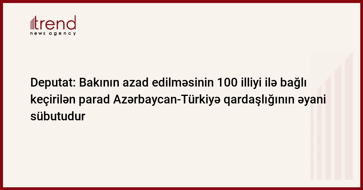 Bakının daşnak-bolşevik qüvvələrinin işğalından azad olunmasının 100 illiyinin təmtəraqlı şəkildə keçirilməsi olduqca əhəmiyyətlidir. Bu barədə Trend-ə açıqlamasında millət vəkili Tahir Rzayev deyib.