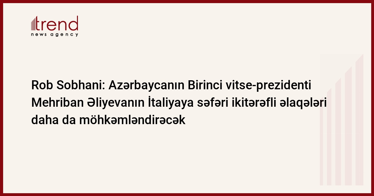Azərbaycanın Birinci vitse-prezidenti Mehriban Əliyevanın İtaliyaya səfəri ikitərəfli əlaqələri daha da möhkəmləndirəcək. Bunu Trend-ə “Caspian Group Holdings”in baş direktoru Rob Sobhani deyib.
