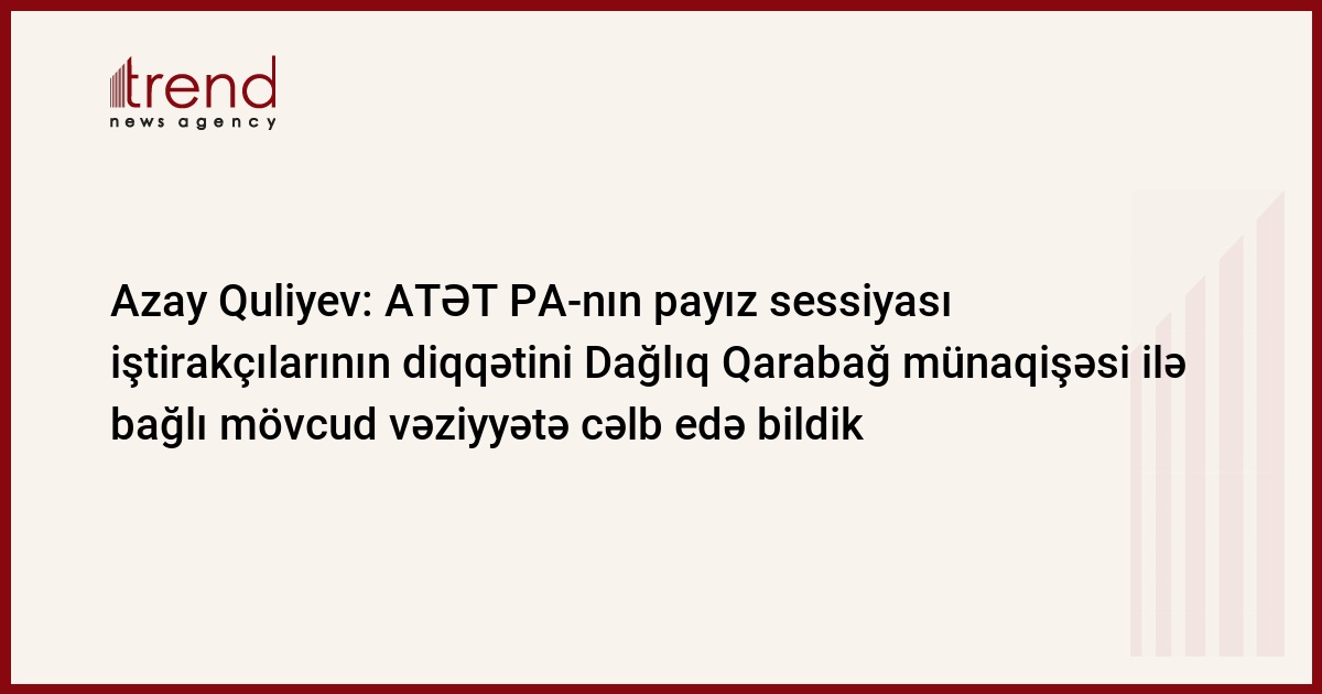 ATƏT Parlament Assambleyasının (PA) Bişkekdə keçirilən payız sessiyasında Ermənistan-Azərbaycan, Dağlıq Qarabağ münaqişəsi ilə bağlı mövcud vəziyyətə görə narahatlığımızı bildirdik, sessiya iştirakçılarının diqqətini problemin aktuallığına cəlb edə bildik. Bunu Trend-ə açıqlamasında ATƏT PA-nın vitse-prezidenti, Azərbaycan Milli Məclisinin deputatı Azay Quliyev qurumun iclasının yekunlarını şərh edərkən deyib.