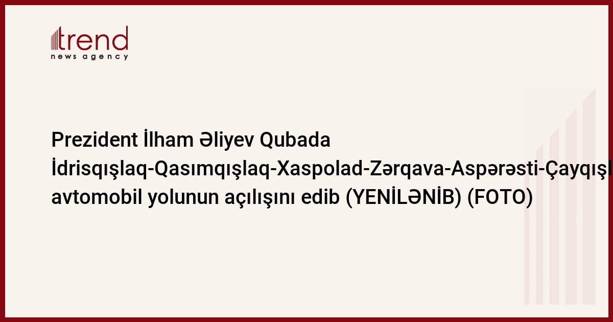 Sonra dövlətimizin başçısı Quba rayonunun İdrisqışlaq-Qasımqışlaq-Xaspolad-Zərqava-Aspərəsti-Çayqışlaq avtomobil yolunun rəmzi açılışını bildirən lenti kəsdi.